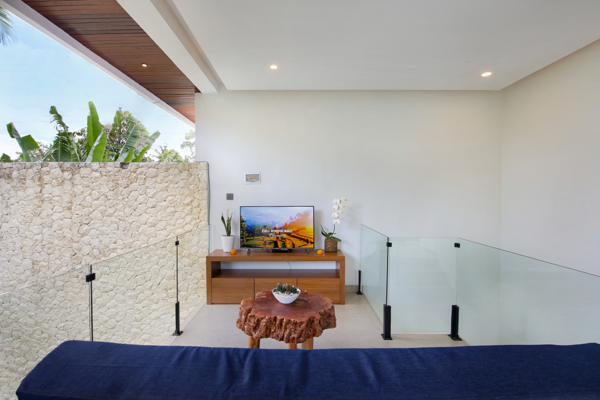 - Upstairs open lounge area with sofa and Smart LCD TV